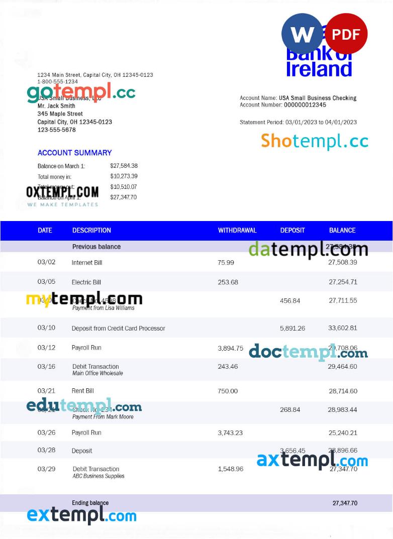 editable template, BANK of Ireland enterprise statement Word and PDF template