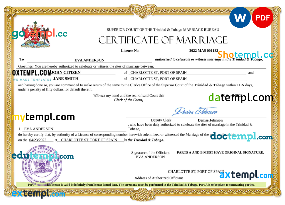 Here you see fully scalable and editable Trinidad and Tobago marriage certificate template (editable sample or fillable example) at the best price – well organized, named & very easy to use.