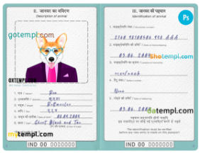 Completely editable India dog (animal, pet) passport template (editable sample or fillable example) of high quality (in English and Hindi languages).