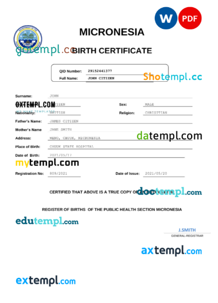 editable template, Micronesia vital record birth certificate Word and PDF template, completely editable