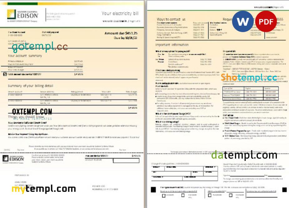 The incredible, editable template (editable sample or fillable example)s. Fully editable USA Southern California EDISON utility bill template (editable sample or fillable example).