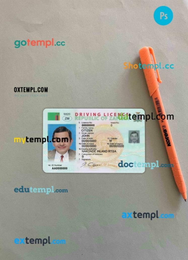 Our Zambia driver’s license template offers two options in one package: editable PSD files for both photo and scan looks. Compatible with Adobe Photoshop, this template is fully customizable, requiring only basic editing knowledge to personalize.